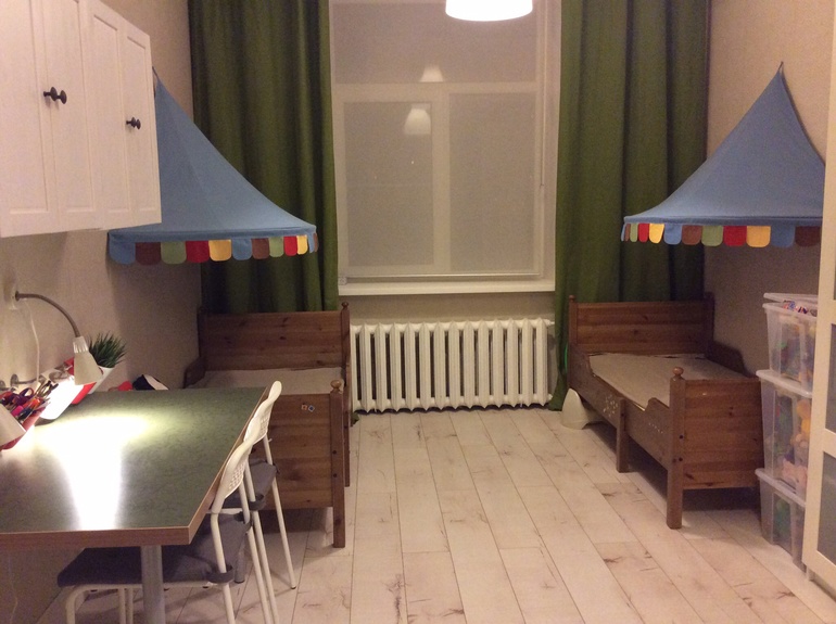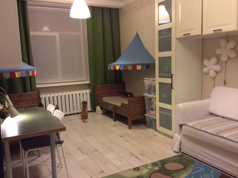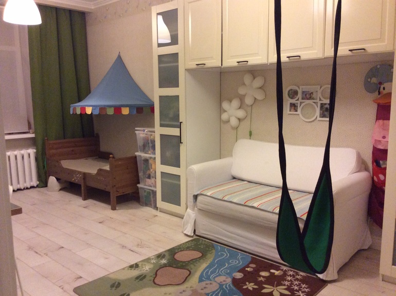 Комната хороша! Вроде не темно, хорошо сочетается с паласом и цветом кроваток. Кстати о кроватках..) а вам не мешает третья ножка которая по середине? И еще острые углы не знаю как назвать — по середине которые. Я все время боюсь ногой ударится об ножку (было уже дело) и эти острые штуковины..мешают ребенку спокойно заползать на кроватку ((