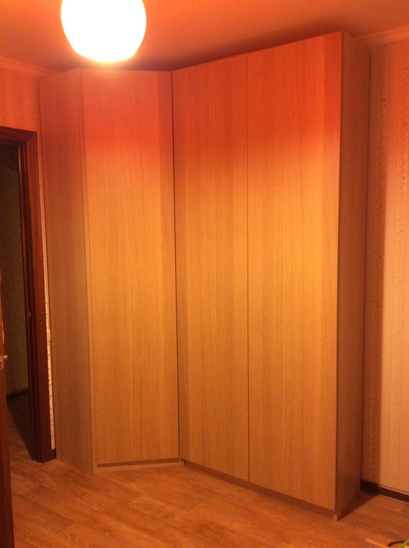 Выбрали вариант, который соответствовал всем-всем критериям: угловой шкаф+35см*1м (то есть, есть глубокий шкаф под широкие плечики, узкий под одежду, игры и немного книг, и ни одна из дверец не стукается об дверь в комнату!!!) Купили в прошлую пятницу еще, но муж уехал в командировку, собрать не могли. Сегодня поставили каркасы и двери, сфотографировала прямо сразу по горячим следам. Сразу под катом.