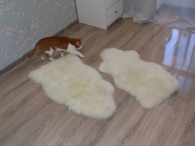 Еще две шкурки натуральные, будут как прикроватные коврики. Но их почему-то жутко боится одна из наших кошек, поэтому, пока нет кровати, временно их убрала.