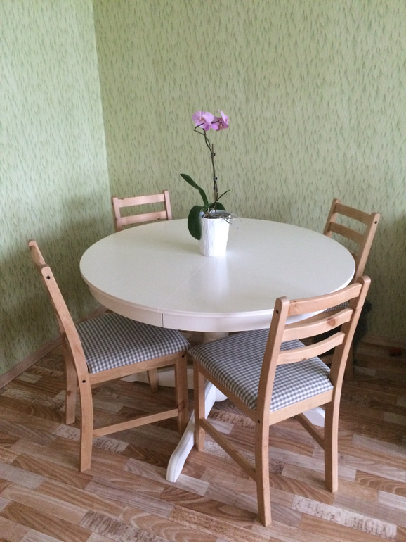 А это купленные недавно стол и стулья для будущей столовой зоны (ремонт будем делать летом, Юху!). Столовая будет находится в гостиной и будет продолжением кухни.