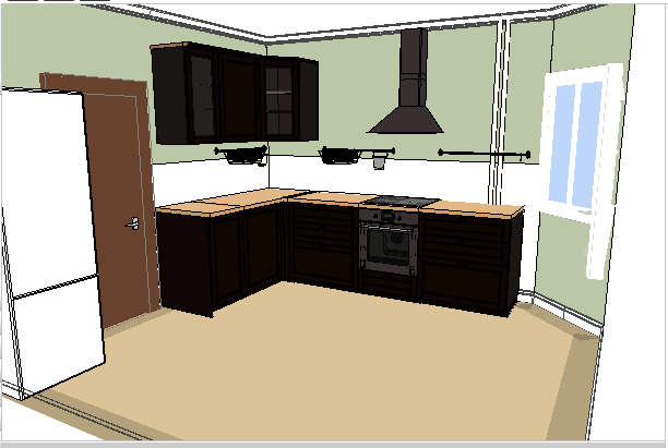 Слева от двери идет встраиваемая ПММ, далее угловой шкаф с белой мойкой (её не получилось вставить в тормозящем планировщике), следом шкаф с выдвижными ящиками, духовка+варочная панель, и шкаф с выдвижными ящиками.