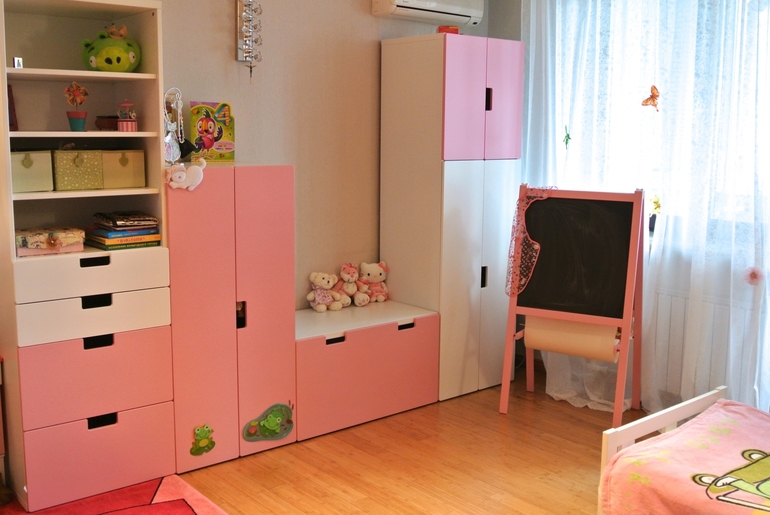 Не читала ниже комменты, но лично я бы сделала 2 кроватки по одной стеночке можно между ними поставить стеллаж Билли, а мебель Стуву собрала вместе, стенкой.