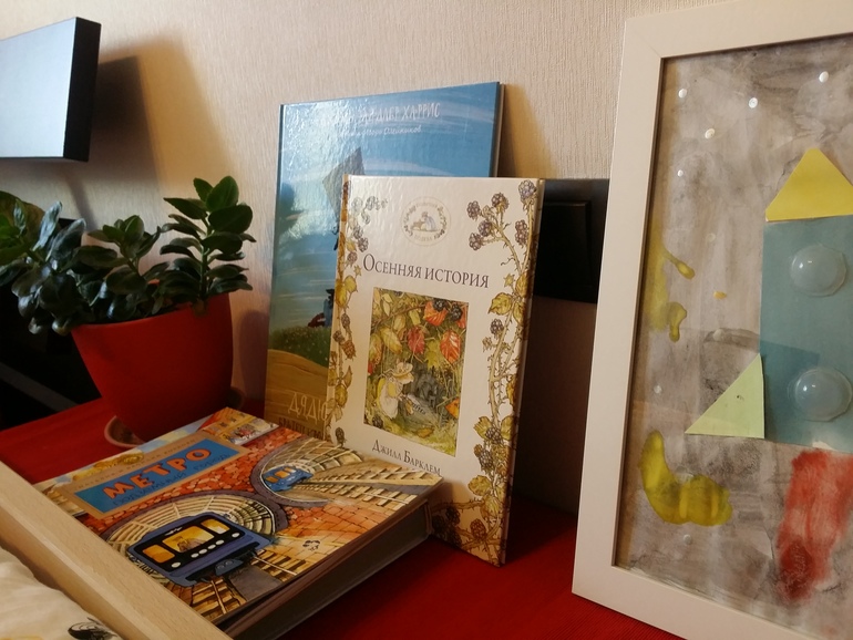 Осень для меня означает закрытие дачного сезона и переезд в город. Прощайте, теплые летние ночи - собрали телескоп, но хранить ненде. Я поставила коробку за изголовье кровати сына и накрыла дорожкой для стола мэрит. Получилась тумбочка. В осеннюю тематику вписалась книжка про осень.