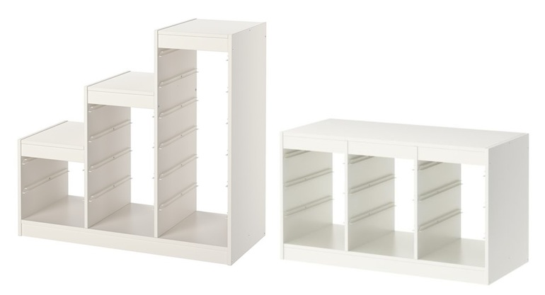 Но вот да, я плюсуюсь к тому, что в Труфаст, лесенкой он, плоский или столбиком, все равно влезает немного. То есть, большая часть игрушек у нас по шкафам. Например, лего-дупло занимает 2 секции 45*60*40 (в Труфасте храним только человечков в мелком ящике. Ну и, понятно, всякие коробки с конструкторами, настолками, развивашками, творчеством, да еще детских книжек вагон. Может, Вам одну секцию вообще столбиком взять на 145см именно для игрушек в ящиках, а рядом еще что-то для остального (Каллакс, Билли, стува).