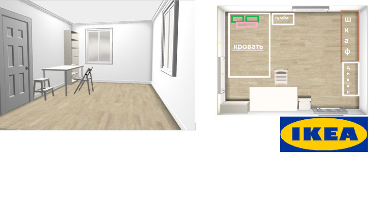 Нужен советДорогие участники!Выручайте,имеем комнату 14 кв.м.Кровать Лейрвик, стелаж Вегби.Шторы на окнах Виван Зеленые.Тумба и Шкаф сов.производства(все будет меняться)Подскажите как можно все переставить или что то добавить, убрать, поменять....места маловато все равно...Рада буду любым идеям.