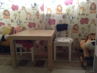 Ну и между ними 2 детских стульчика КРИТТЕР с подушками ФАБЛЕР. Стол ЛАКК (он у нас появился раньше, чем дети)