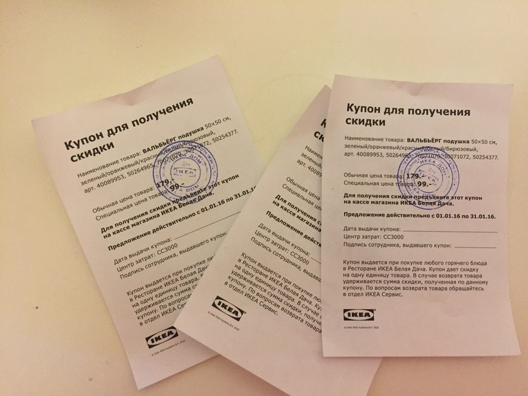 ПокупкиПоехали в икею, купили мебель ребенку и мелочи, из них 3 подушки. Сдали все в доставку. Пошли в ресторан покушать и там нам дали 3 купона на скидку этих подушек( почему в самой икеи об этом не где не указано. Как буд то люди сначала едят а потом идут за покупками(