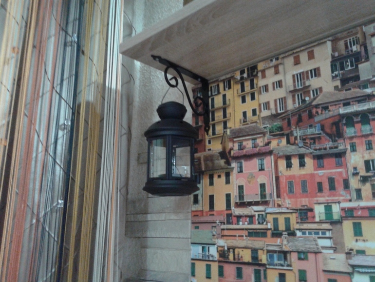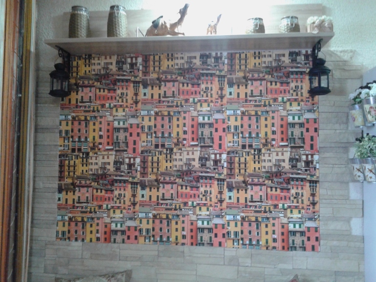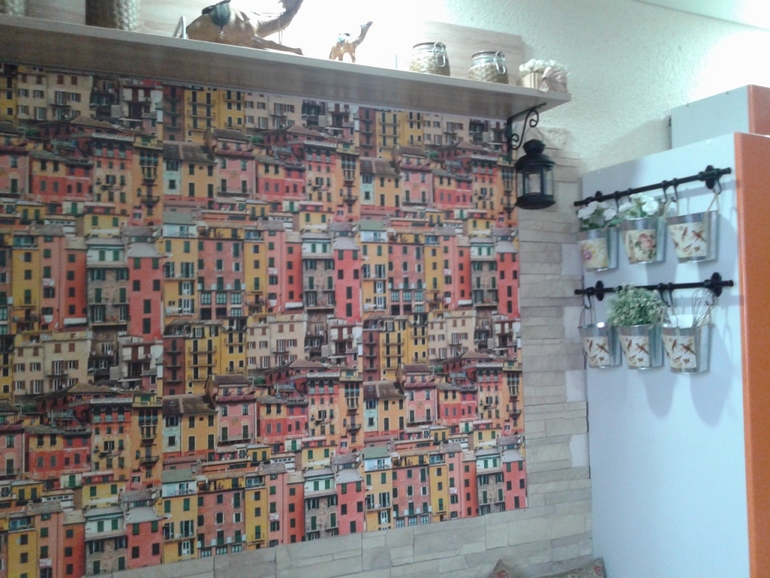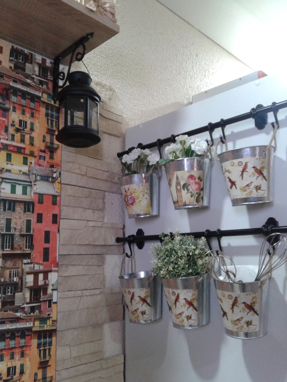 Оформляла часть стены на кухни,над диваном.Обои,камушки,фонари на кронштейнах,релинг Икея.Остальные фотки убрала под кат .Может кому идея пригодится...