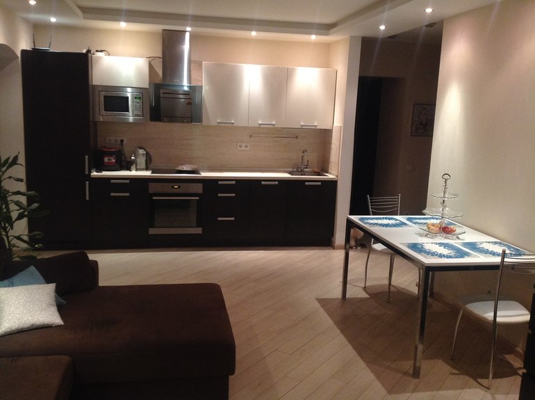 Комната у нас 30 метров. У нас как раз она гостинная-кухня, мы перенесли кухню в корридор, а корридор объединили с залом и таким образом сделали из трех комнатной, четырехкомнатную.
