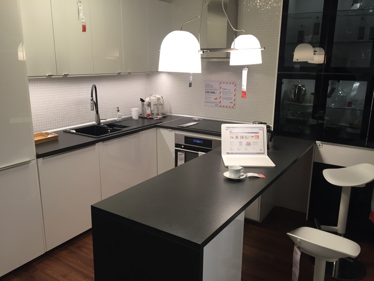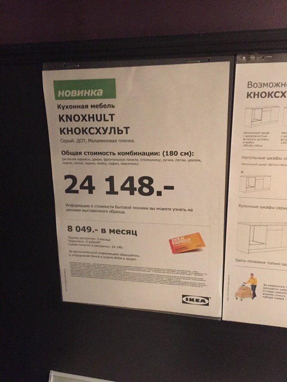 Смотрите внимательней на фото, там разные кухни, разные цены и описание что входит в стоимость, а лучше конечно едьте в Икею и там вам наверно все посчитают, я же просто гуляла по магазину и фоткала "витрины"