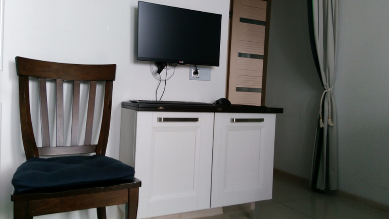 Наш компьютерный откидной стол - проект и реализация мужа. Окрыв дверцы и откинув столешницу, мы получаем полноценное удобное рабочеее место. Внутри шкаф-стол разделен на полочки, где хранится пароварка, наушники, клавиатура, мышка с ковриком.А еще, что не мало важно: можно и телевизор посмотреть, и за компьютером поработать!