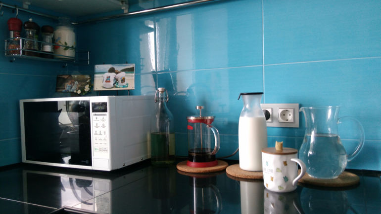 Площадь нашей кухни ни много ни мало 9,6 кв.м. Это единственное яркое пятно во всей белостенной квартире!