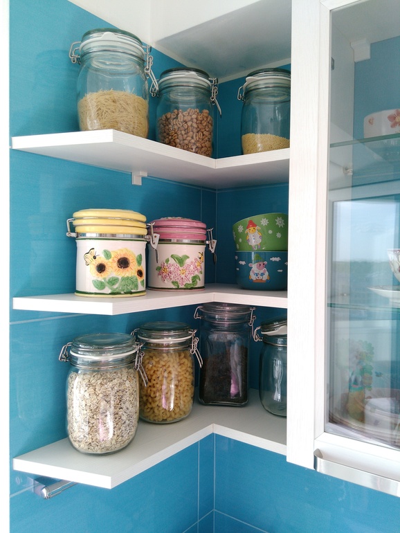 Нижние шкафчики удачно прячут не только противни, блинницу, блендер, но и маленького помощника :)
