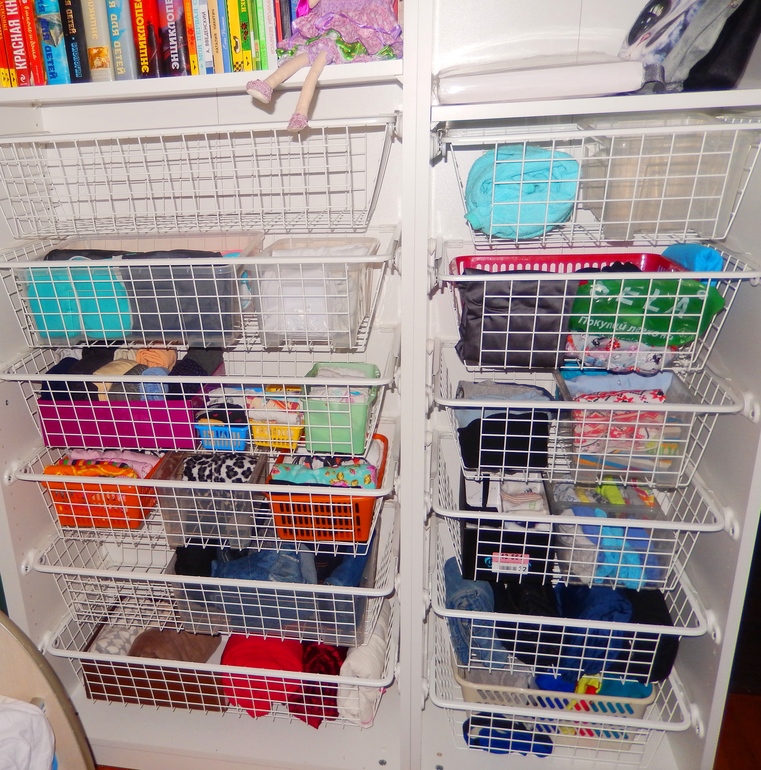 Я корзины люблю. В них аккуратно все складывается и видно хорошо. У меня Паксы 35 см глубиной, но я не тряпишница, мне много не надо. И пару штанг в шкафу 50 см. для вещей. Для постельного 2 полки. И ближе к потолку полки для редкоиспользуемых вещей. Вот у 2хдетей так выглядит их гардероб. У нас с мужем так же+штанги.