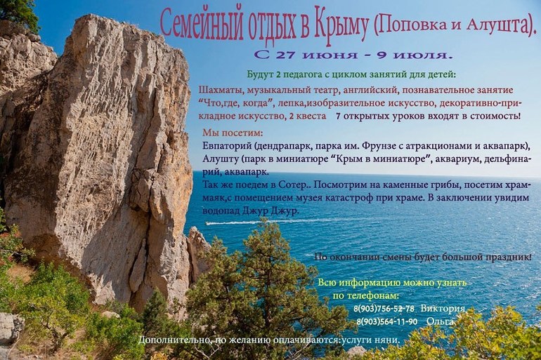 Добрый вечер. Предлагаю отдохнуть с нами в Крыму. Программа составлена. Отдых получится познавательно-активным. Хотя и время для отдыха у моря так же будет.