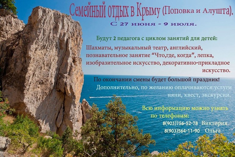 ...Я организатор путешествий и педагог по творчеству. Ищу попутчиков как с детьми,но желательно с 3 лет,так и без детей. Поездка в Крым с 27 июня по 9 июля. Будем жить в Поповке (запад Крыма) и под Алуштой (юг Крыма) Планирую несколько экскурсий,пляжный отдых,заня...