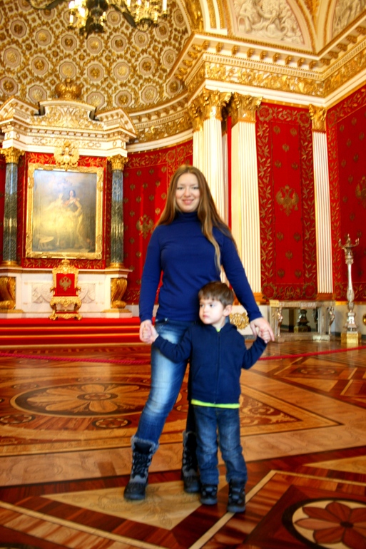 В тот же день после обеда мы пошли в Эрмитаж))) Да-да, я в курсе, что для посещения Эрмитажа и нескольких дней недостаточно. Но с ребенком мы старались быть реалистами и сделать обзорную экскурсию без подробностей. Билеты мы купили через интернет с правом видео- и фотосъемки, так как были напуганы рассказами о 2х-3хчасовых очередях в мороз. Но к февральским будням это видимо не относится, очередей почти не было. Наученная опытом Русского музея, я рассказала Науму, что мы идем в настоящий дворец, где были балы, где танцевали принцы и принцессы. В результате ребенок искал в каждом зале танцующих Золушку с принцем и, не найдя, расплакался)) Успокоить его помог только рыцарский зал.