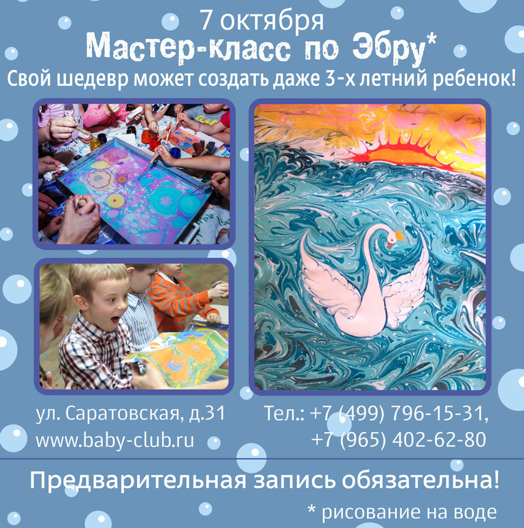 Эбру - очень интересная, волшебная техника рисования на воде. В мастер-классе могут участвовать и взрослые и дети. Подробности можно узнать по