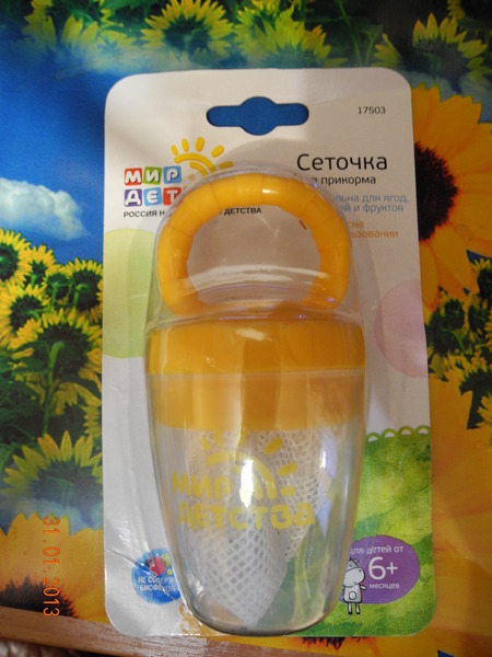 Ничего сложного.. Режите небольшие кусочки фрукта и кладете в сеточку, закрываете и даете малышу.. И он через сеточку получает либо сок либо пюрешку от фрукта (смотря как сосет эту самую сетку).. Хорошая вещь, можно быть спокойной, малыш не подавится куском и получает витамины натуральные!)