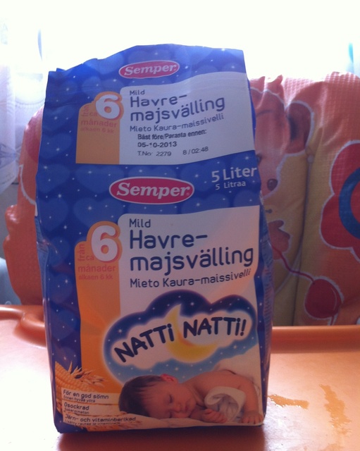 Здравствуйте! Мы такое покупали, там написано водой разводить. Пробовали раза 3-4 - малыш не стал есть, не пшло у нас это. В год ещё пробовала давать, уже с добавлением яблока, тут ( в Швеции) этих Веллингов куча.... Моему ничто не понравилось....