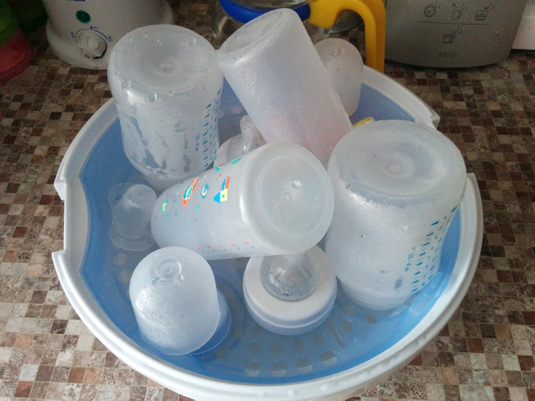 Пару дней помаялась я с кипячением этих 2 бутылочек и созрела на покупку стерилизатора, т.к. муторно кипятить и бутылки мутнеют. Выбор пал на авентовский для микроволновки. Нам идеально подошел, покупкой довольна. Плюс докупила еще 2 бутылочки по 120 мл 2 авент и 2 на 120 мл неизвестной фирмы подарили. Так у нас стало 5 бутылочек на 120 мл: 4 для смеси и 1 для водички.