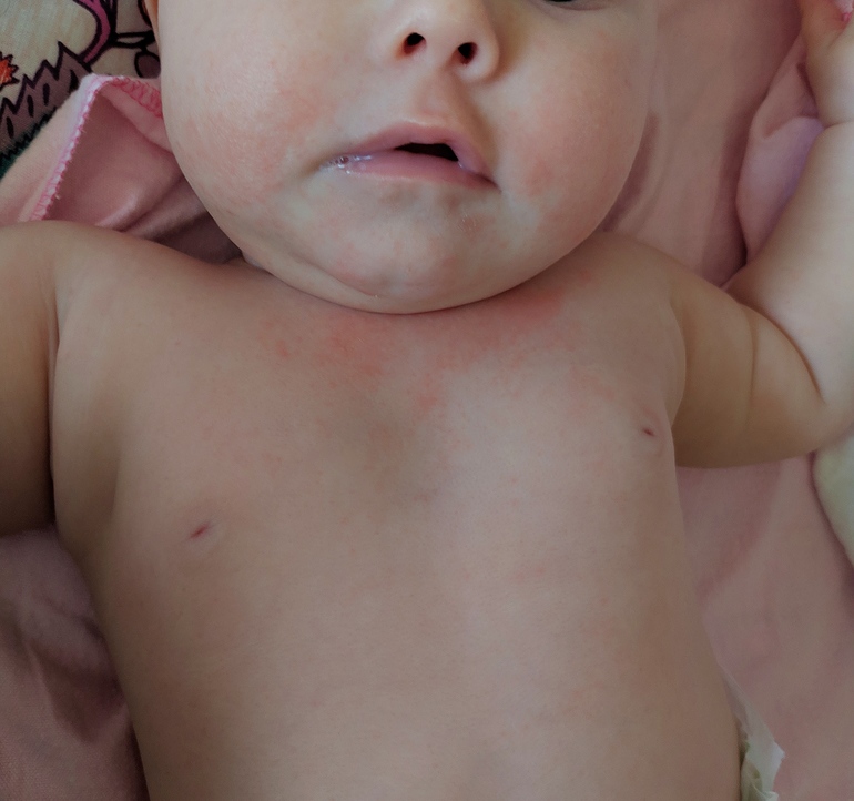 Щеки, грудь сразу обсыпало, дала фенистил пару дней, сегодня до пупка руки немного, спина уже