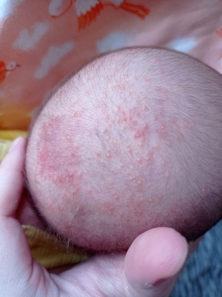 Последнее фото сделано сегодня, это затылок. Сыпь располагается только на лице и голове, тело чистое.