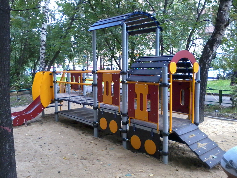 Внезапно в районе стали площадки обновлять. Новая (ну, год, наверно ей) в парке при входе с 11 Парковой. Только что обнаружили на перекрёстке 3 Парковой и ул Первомайская: кораблик, паровоз и кабина грузовика. Смутил рыхлый песок в качестве покрытия, нелепо и грязно, но может, доделают?.. upd: доделали, положили поверх песка пластиковую плитку-решётку.