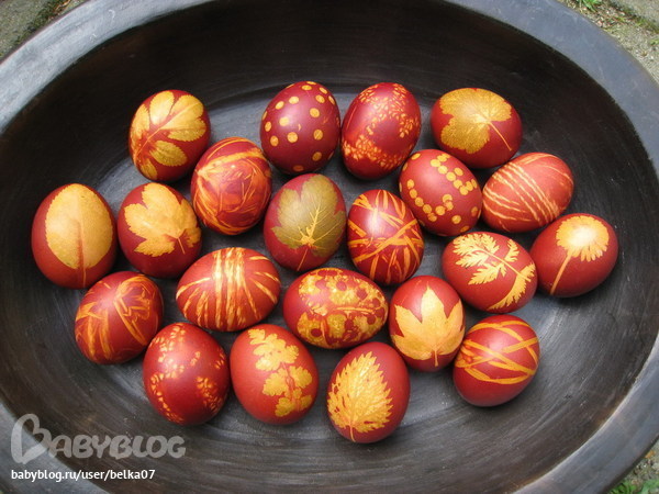 я в прошлом году так красила ,листики от петрушки прикладывала,красиво получается)