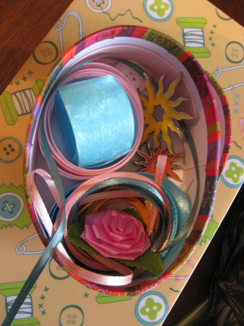 А в коробочке еще был маленький склад из ленточек, пуговичек, розочки и подвесок. Все такое яркое и позитивное!