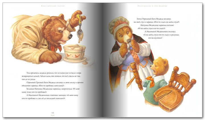 Эта превосходно иллюстрированная книга содержит десять классических сказок - лучших сказок всех времен: «Златовласка и три медведя», «Кот в сапогах», «Красная шапочка», «Белоснежка», «Мальчик-с-пальчик», «Ганзель и Гретель», «Принц-лягушонок», «Гном Тихогром», «Золушка» и «Три поросенка». Размеры (Ш×В×Т) см: 280 | Объем: 144 с. Иллюстрации Скотта Густафсона трудно называть рисунками. Это картины. Да ведь и пишет их художник маслом по холсту - настоящие полотна! Каждую из своих книг он создаёт несколько лет, ведь каждая сказка - это несколько живописных работ. Вот почему на таких иллюстрациях, как эти, можно и нужно приучать к чтению наших детей, воспитывать у них вкус и любовь к Книге. Он не только иллюстрирует, но и пересказывает свои любимые волшебные истории с участием прекрасных принцесс, отважных принцев и других известных сказочных персонажей. Художник работал над иллюстрациями к своим любимым сказкам более четырех лет и написал за это время семьдесят пять картин маслом. Его уникальная манера, сформированная под влиянием знаменитых книжных иллюстраторов Н. С. Уайта, Артура Рэкхема и Норманна Роквелла, пленяет сердца людей всех возрастов. "Я хочу, чтобы чувства моих персонажей были понятны детям, - говорит Густафсон, - но я хочу создать что-то такое, к чему они будут возвращаться, когда станут взрослыми, чем смогут поделиться уже со своими детьми… что-то, что заставит их сказать: "Знаешь, мне в детстве нравились эти картинки, а сейчас я вижу в них нечто большее". Эта книга, несомненно, найдет свое место на полке каждого ребенка; право, она стоит того, чтобы он, когда вырастет, прочитал ее своим детям и внукам. И правнукам. Об авторе Создавая свои первые художественные образы, Скотт Густафсон черпал вдохновение из мультфильмов Диснея и Уорнер Бразерз. Еще старшеклассником на самой дальней полке в библиотеке он нашел книгу легенд о короле Артуре с иллюстрациями Н. С. Уайта. Проработка деталей, сочные цвета, исходящая от них энергия покорили и вдохновили юного художника. Повзрослев, он переехал в Маренго, штат Иллинойс. Тогда Густафсон был убежден, что хочет стать аниматором. Несколько лет он изучал мастерство анимации в Чикагской академии искусств и Колумбийском колледже (в том же штате Иллинойс). За время учебы, кроме Н. С. Уайта, он открыл для себя иллюстрации Артура Рэкхема, Норманна Роквелла, Максфильда Перриша и других художников. Яркая классическая манера Скотта Густафсона быстро нашла отклик у издателей и читателей, вскоре его работы стали появляться в разнообразных журналах: от "Сатердэй Ивнинг Пост" до "Плэйбой". Он занялся книжной графикой, иллюстрировал знаменитые книги "Ночь перед Рождеством", "Щелкунчик", "Питер Пэн" и многие другие, выпустил два оригинальных издания: "Алфавитный суп" и "Звериный оркестр". В 2007 году в издательстве "Гринвич Уоркшоп Пресс" вышла в свет книга "Песни Матушки Гусыни" с иллюстрациями Густафсона, имевшая большой успех как у детей, так и у взрослых. Классические сказки Эта превосходно иллюстрированная книга содержит десять классических сказок - лучшихсказок всех времен. Художник не только проиллюстрировал, но и пересказал свои любимые волшебные истории о забавных приключениях, прекрасных принцессах и отважных принцах.Художник Скотт Густафсон работал над иллюстрациями к своим любимым сказкамболее чет