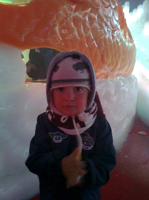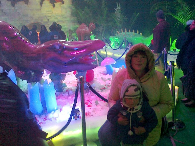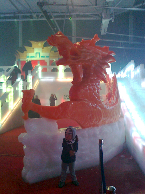 После представления мы пошли на выставку ледяных скульптур. Я заранее узнала, что там очень холодно, -10 градусов, что нужно тепло одеваться. Одеться заранее было невозможно, у нас на улице +30 сегодня, теплые вещи взяли с собой (потом оказалось, что там выдают куртки и штаны, будем знать). Внутри было действительно дико холодно, я уже совсем отвыкла от такого. Израильтяне жгли не по децки: видела людей в кроксах, детей в сандаликах, мужика с футболкой на голове (видимо она его ну очень грела)). Было очень много детей в резиновых сапогах, так смешно, для израильтян это действительно зимняя обувь))