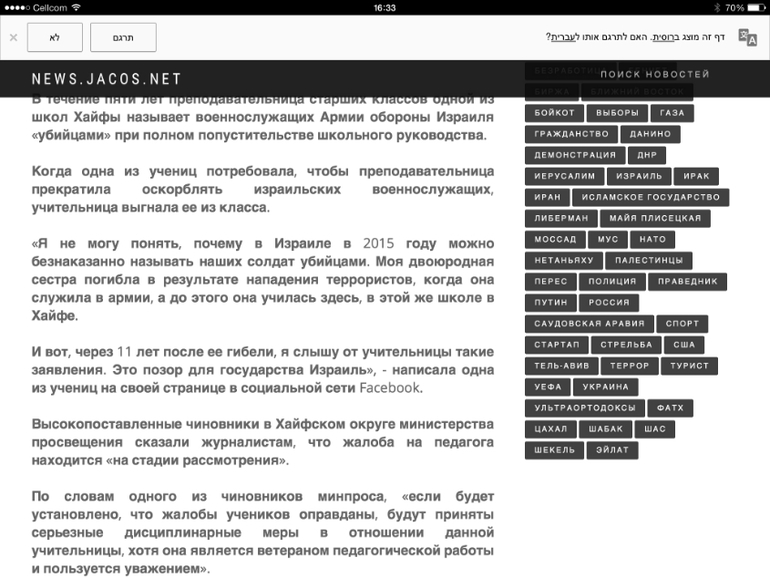 Мое мнение, что учителя в школах должны учить. А свое мнение оставлять при себе. Дети очень восприимчивы и где-то гораздо умнее нас. Да и странное дело среди учителей последнее время. То орут на детей, есть такие, что даже с матом, то задавливают бесконечными жалобами, то навязывают свое мнение. А по факту учебы - ноль! Этот случай в Хайфе считаю действительно мерзостью. Когда это наша армия была позором для страны??? Да если бы не наша армия нас бы уже давно сожрали заживо! Какое право эта женщина имеет говорить такое, тем более перед детьми! Люди оглумели что ли? Хочет высказаться? Так высказывайся только не перед детьми, а в открытую! Что же как крыса вести себя, если тебя так возмущает положение у нас в стране! Потому что за это можно и схлопотать... а чувства детей и их родителей можно топтать.