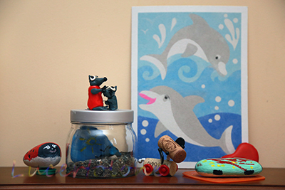 Для кого-то это непонятный набор ерунды: мыши какие-то странные, камни примитивно разрисованные, банка с серым песком, собака из винных пробок, дельфины зачем-то... А для нас это воспоминания о Сочи, которые украшают полочку перед обеденным столом. И пусть мы до сих пор лечим животы, нам все равно было там очень и очень хорошо! В жаркие часы мы развлекались таким вот образом, наделали всякого разного больше чем за месяц в Москве. Смотрим и радуемся =)