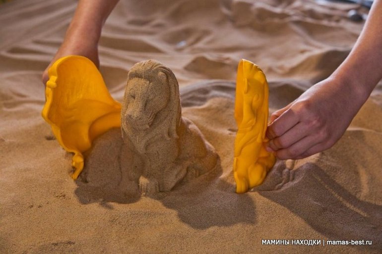 Стоит совместить части формы с материалом, поставить их на землю или на стол и убрать детали, и вы получите идеальную фигурку, у которой проработаны все детали, включая гриву (у льва) или усы (у кошки). Трехмерные формочки познакомят малышей с понятием объема и формы.