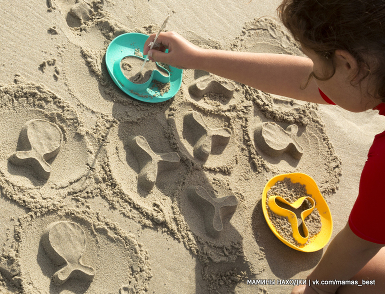 Это волшебные формочки, их не нужно наполнять песком! Просто вращайте формочку, и она заполнится песком сама, затем уберите лишнее, поднимите и… куличик готов! Тоже самое можно проделать со снегом или мыльной пеной! Используйте воображение, чтобы украсить куличики.