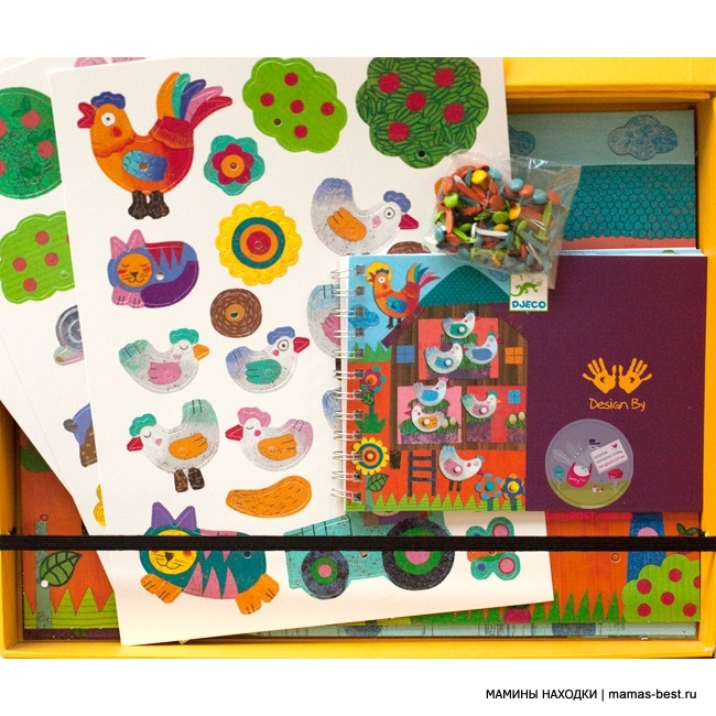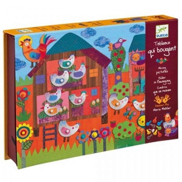 В комплекте ребенок найдет деревянную основу, красочные карточки с заданиями, а также множество пластиковых гвоздиков разной формы. Ребенок должен собрать картинку согласно инструкции, в результате чего у него получатся яркий петушок, забавный слоненок, красочный львенок и другие животные.