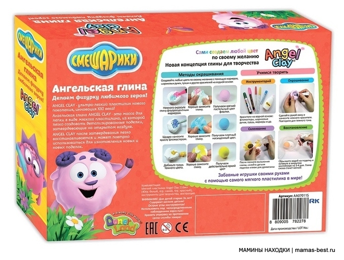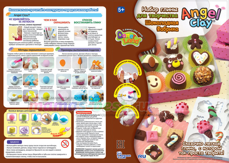 - Глина Angel Clay НЕТОКСИЧНА И БЕЗОПАСНА. Продукция компании Donerland успешно прошла испытания согласно требований международных стандартов качества ASTM, EN-71 и других. Товар сертифицирован. Соответствует требованиям ТР ТС "О безопасности игрушек".