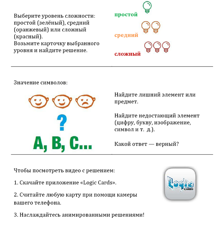 А если все же возникли проблемы, на последних карточках есть ответы. Но не спешите заглядывать туда, ведь так приятно решить самую сложную задачу без подсказок. Ребенок собирает головоломку и учится строить логические цепочки, продумывать шаги наперед, создавать собственные алгоритмы. Он развивает пространственное мышление, визуальное восприятие. Ваш ребенок создает в сознании разнообразные абстрактные модели и учится работать с ними. Развивает внимательность, память, смекалку и скорость реакции.