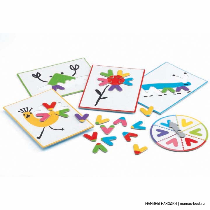 Вращайте друг за другом колесо и сочетайте цвета в соответствии с рисунком на карточке. Выигрывает тот, кто последним соберет рисунок.