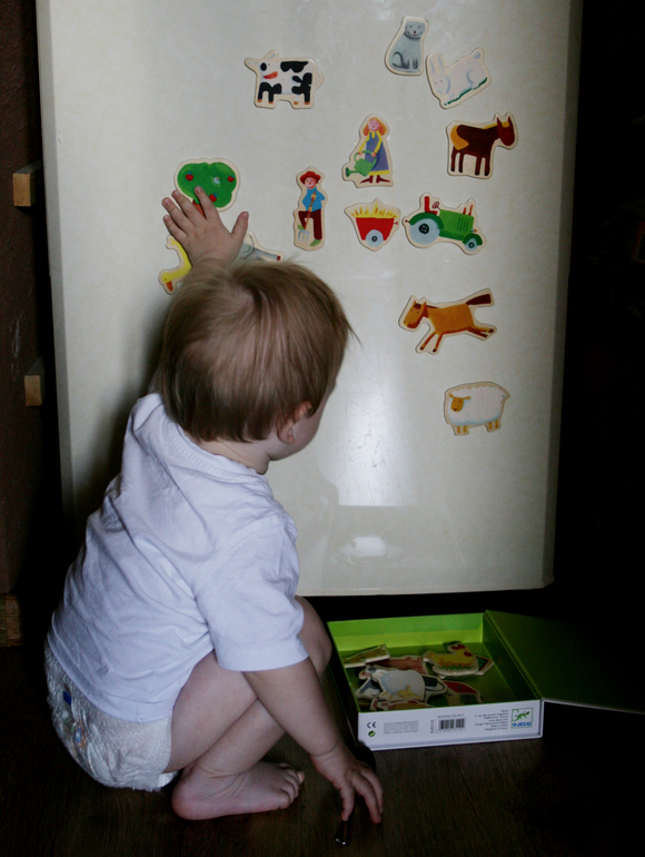 ...или (до безконечности, все что взбредет в голову)) если Ваня играет сам, то перебирает все магнитики, выбирает себе любимчика (обычно это гусь, или кот)) - и ходит с ним везде долго-долго. Может немного погрызть)). Если перебираем вместе, то безостановочно может тыкать во всех по очереди со словом "этя" - мол, это кто?)) я называю, кто это, показывает на следующую и так без остановки - можем сидеть так оооочень долго. Причем зверей уже всех прекрасно знает, но очень нравится, когда он выбирает, а я называю)).