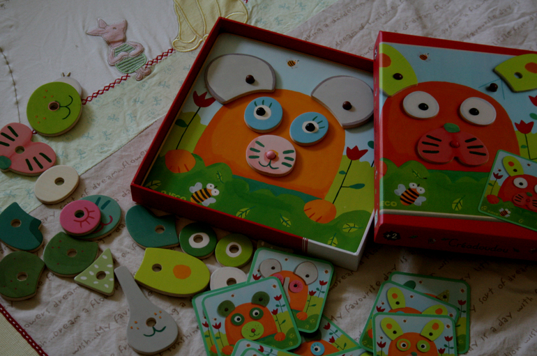 Качество отличное, мордашки премилые, цвета очень приятные и зверята получаются очень похожие - заяц, мышь, медведь, кошка и собака. Комбинируя различные сочетания носов, глаз и ушей, можно собрать любого из них. В комплекте 5 пар глаз, 5 пар ушей, и 5 носиков-мордочек, основная доска-планшет с головой и штырьками и набор карточек-образцов.