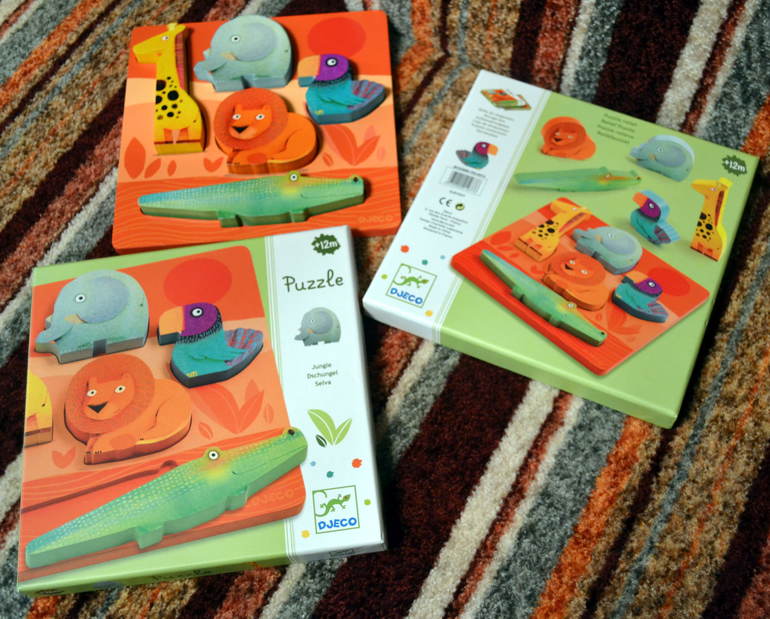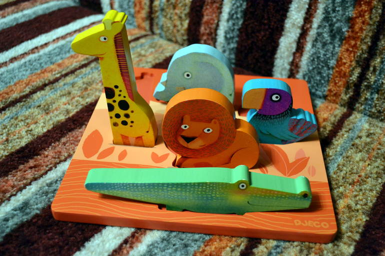 Предыстория. Нашим первым самостоятельным приобретением в Лавочке Чудес стал вкладыш Джунгли - Деревянная рамка - вкладыш "Джунгли" Djeco, арт. 01037. 939 руб.. На самом деле я очень долго металась, столько всего хочется, но все больше на вырост. Решила взять на сейчас. Нам 10 месяцев и вкладыша такого плана у нас нет, только с пимпочками, ну и вообще я аналогов не видела. А еще мне нравятся жирафики, у нас они и на коляске живут, сынок уже их знает и показывает =)