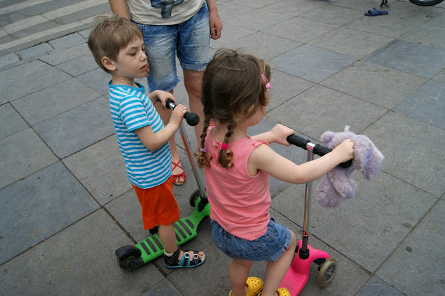 Коляску в этот раз мы, естественно, не брали, а взяли детям самокаты. Хотя Вита могла бы и без него обойтись, она, как оказалось, прекрасно ходит пешком на длинные расстояния, а если что - папины плечи спасают. Зато внимание было обеспечено!