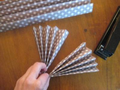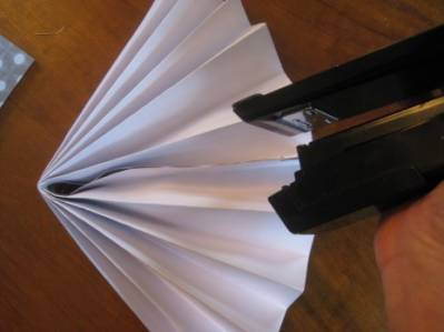 Для начала необходимо сложить бумагу стопкой (один лист на другой), и чем больше слоев бумаги вы положите, тем пышнее будет ваш помпон. Ширина бумаги будет равняться диаметру вашего помпона. Затем нужно складывать гармошкой подготовленную стопку бумаги, вот так: