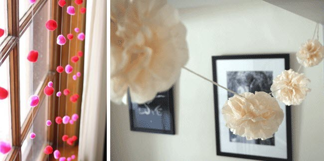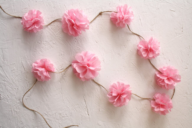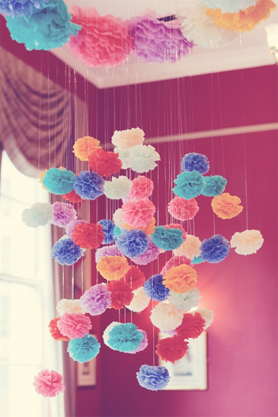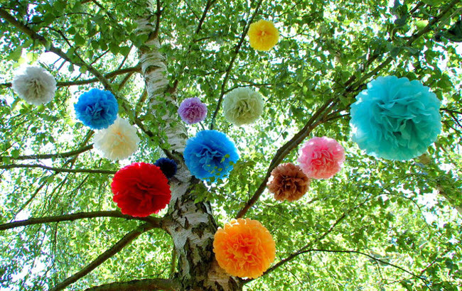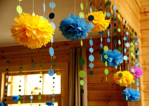 Для того, чтобы сделать такие очаровательные украшения, необходимо запастись тонкой упаковочной бумагой нужного цвета, ножницами и леской. Бумагу можно использовать гофрированную, которую легче найти у нас в продаже, и которая тоже отлично подходит для изготовления помпонов.