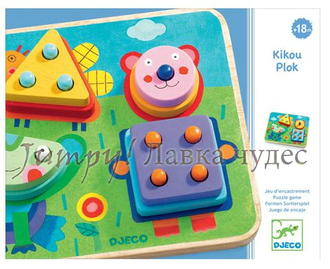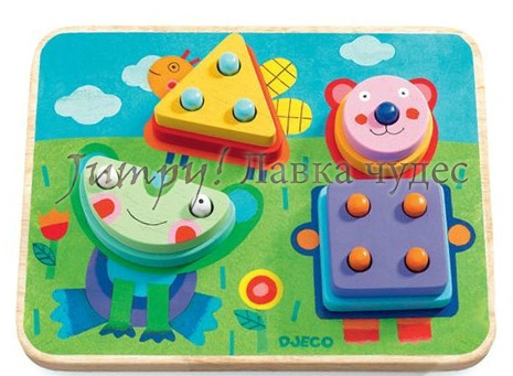 Деревянный пазл "Мордашки" Djeco, арт. 01685. 1299 рубПрекрасная развивающая игра для самых маленьких. Развиваем мелкую моторику, внимательность, творческое мышление, учим части тела и животных.На основной игровой пластине с ярким фоном и схематической картинкой есть небольшие штырьки, на которые ребенок может насаживать разнообразные детали. Ставим карту-фон и добавляем глазки, носики, рты, ушки - и получается очаровательная мордочка зверюшки!В комплекте: 10 карт-фонов, 25 деталей.