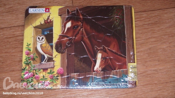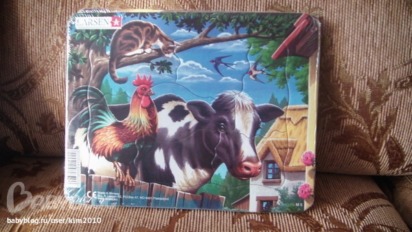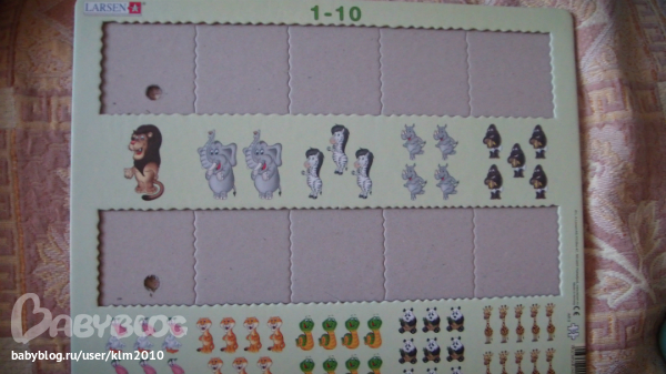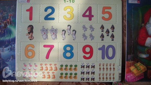 пазл Larsen Счет 1-10. Тоже очень понравился, потому что нет ничего лишнего, что отвлекало бы внимание, только цифры и животные, которых нужно считать. Цифры вынимаются и что не мало важно, нарезка сделана так, что например, цифра 1 уже не подойдет туда, где количество 2 или 3 и тд., т.е. если не подходит, ребенок уже точно знает что он ошибся.