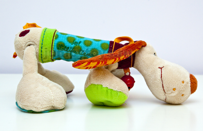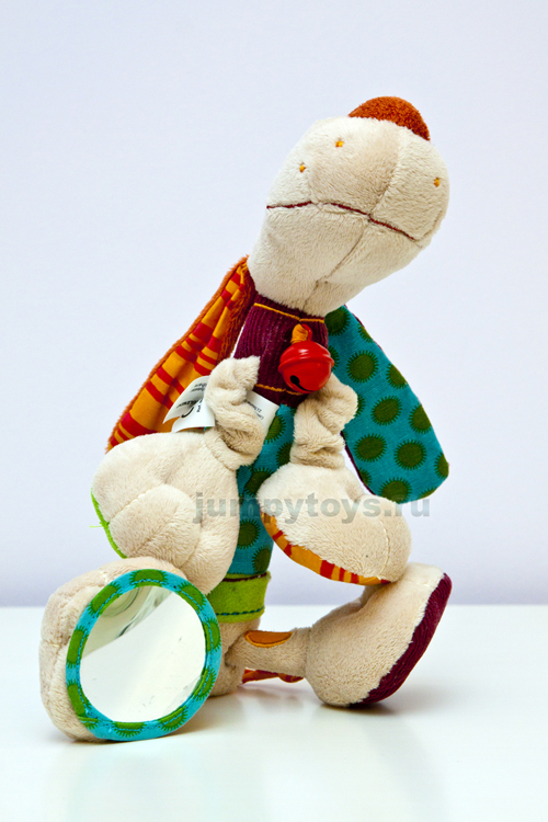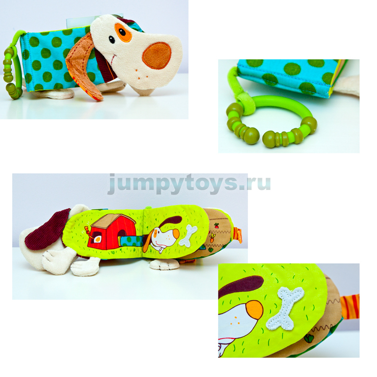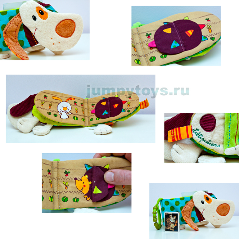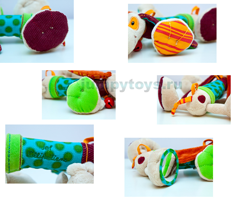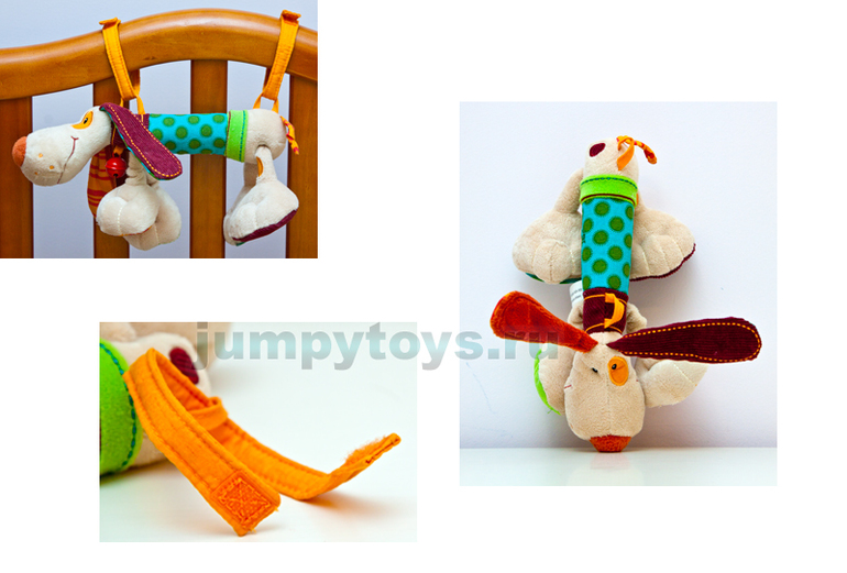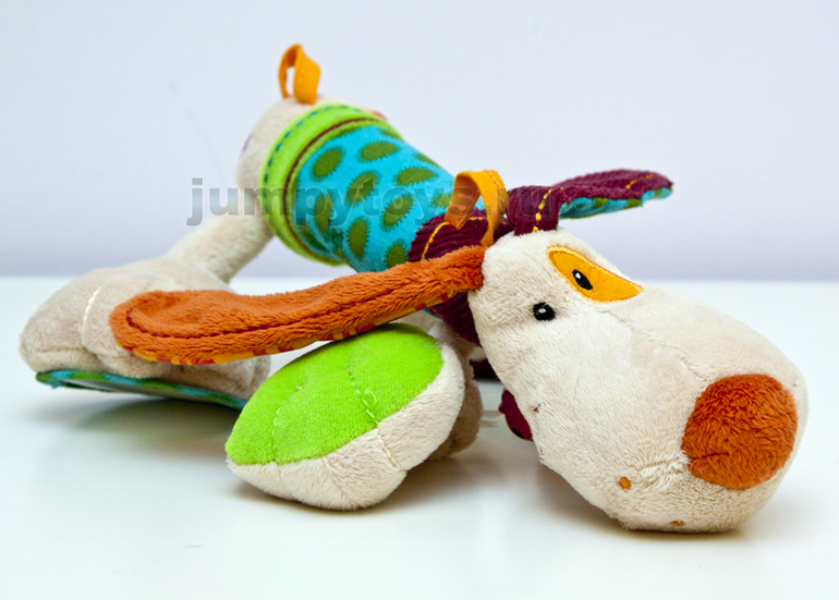 Джеф отвечает всем потребностям малютки. Он шуршит, гремит, позванивает, вибрирует, местами даже растягивается. А еще у него есть зеркальце (собственное отражение это ж такое открытие!). Две оранжевые петельки позволят прикрепить щенка к стульчику для кормления, кроватке, автокреслу и т.п.