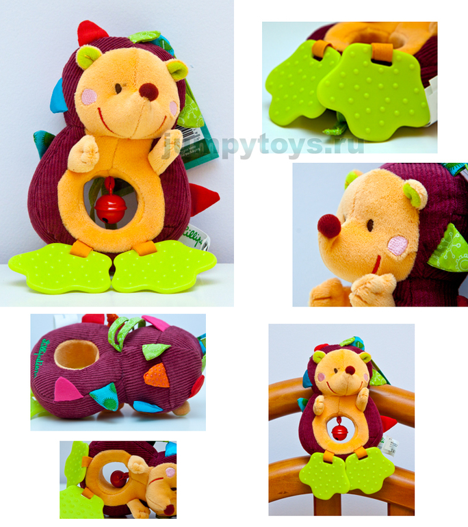 Наверное в 90% первым лесным зверем, о котором рассказывают малышу, является ежик. Поэтому его не могло не быть в коллекции Lilliputiens. Подвесную погремушку можно брать с собой куда угодно: она легко прикрепляется к автокреслу, коляске, стульчику для кормления, кроватке и т.п. Источник звука в виде маленького бубенчика, а также мягкие иголочки, надолго заинтересуют малыша. К тому же и лапки у ежика не простые, посмотрите повнимательнее, это же прорезыватель! О пользе этого предмета вы тоже узнаете вскоре после рождения малыша =)